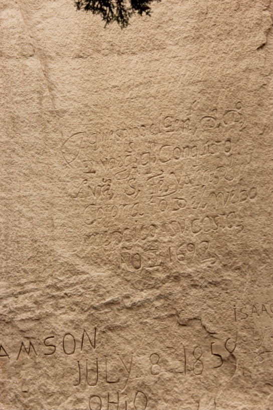El Moro is also known as Inscription Rock. It’s main feature is a 200-foot sandstone cliff rising from the valley floor and bearing inscriptions dating back centuries. The rock sits along an ancient east-west trail that has been frequented by travellers since prehistory as El Morro was the only reliable source of water in the area. There is no spring. The pool at the base of the rock is fed largely by rainfall in July, August and September and by melting snows. It holds about 200.000 gallons of water.